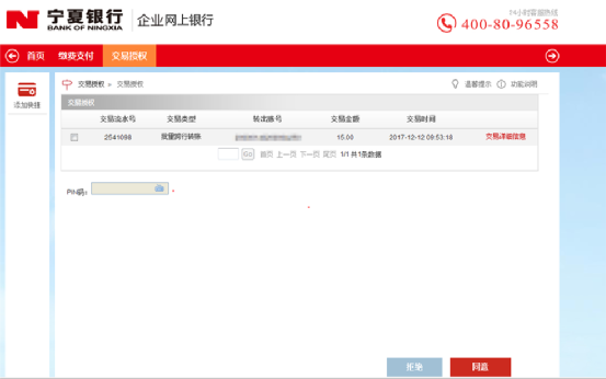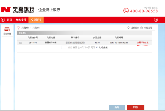 6、用企業(yè)審核員用戶登錄網(wǎng)銀系統(tǒng),進(jìn)入菜單“交易授權(quán)->交易授權(quán)”,點(diǎn)擊交易類型為“批量轉(zhuǎn)賬”記錄的最后列“交易詳細(xì)信息”,查看交易詳細(xì)信息,然后點(diǎn)擊“返回”;勾選待審核的記錄,在PIN密碼框里輸入證書密碼,點(diǎn)擊按鈕“同意”,即審核同意。