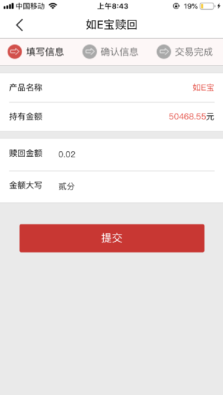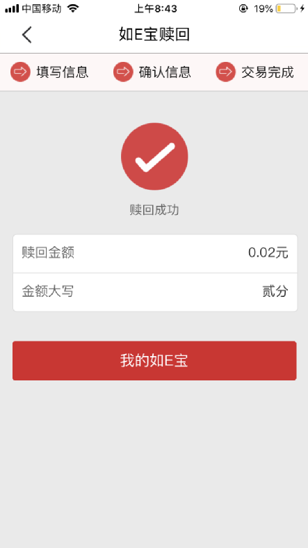 第五步:如有資金使用需求,可進(jìn)入“如E寶”菜單,輸入贖回金額,驗(yàn)證支付密碼